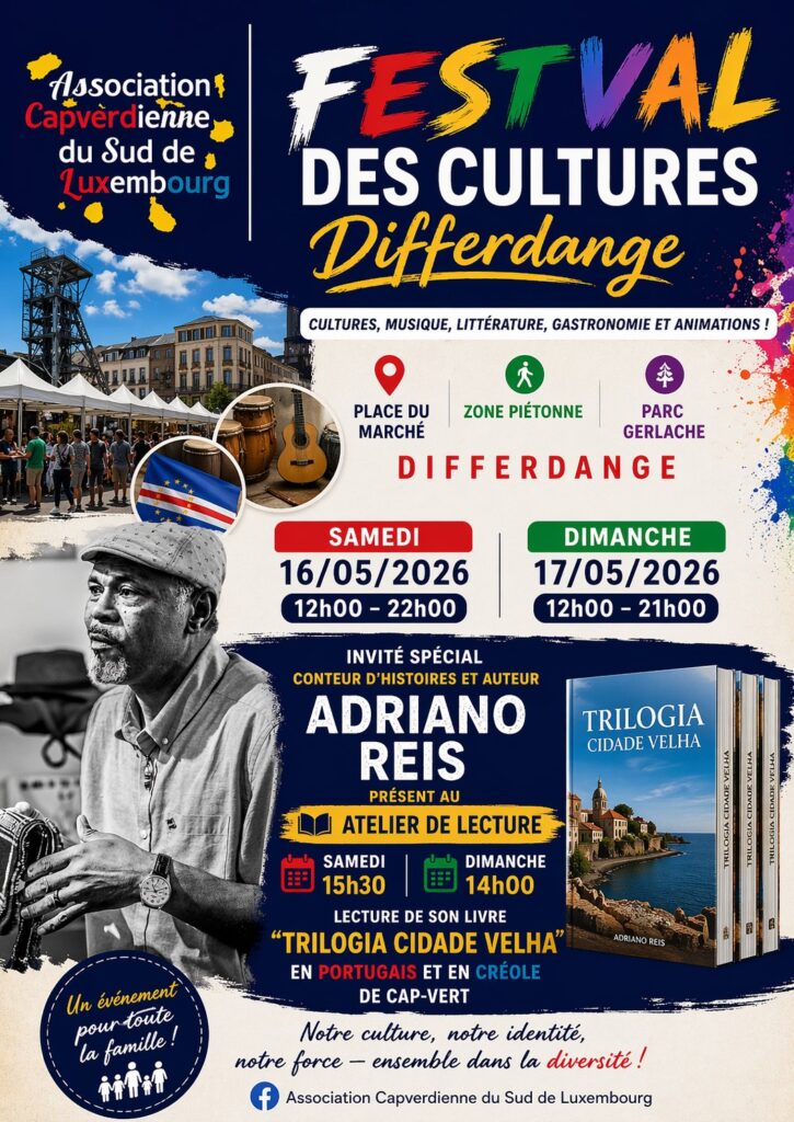 Le dimanche 17 mai prolonge cette dynamique. À 13h, le chanteur Plácido Vaz monte sur la grande scène. À 14h, Adriano Reis revient pour un atelier autour de sa trilogie. Puis à 15h30, Melissa Borges anime une nouvelle lecture, cette fois pour les enfants de 6 à 8 ans, avec le livre « Lauryn that’s me », en luxembourgeois. Ce week-end est une belle occasion de découvrir la richesse de la culture de Cabo Verde, dans une ambiance multiculturelle conviviale et ouverte.